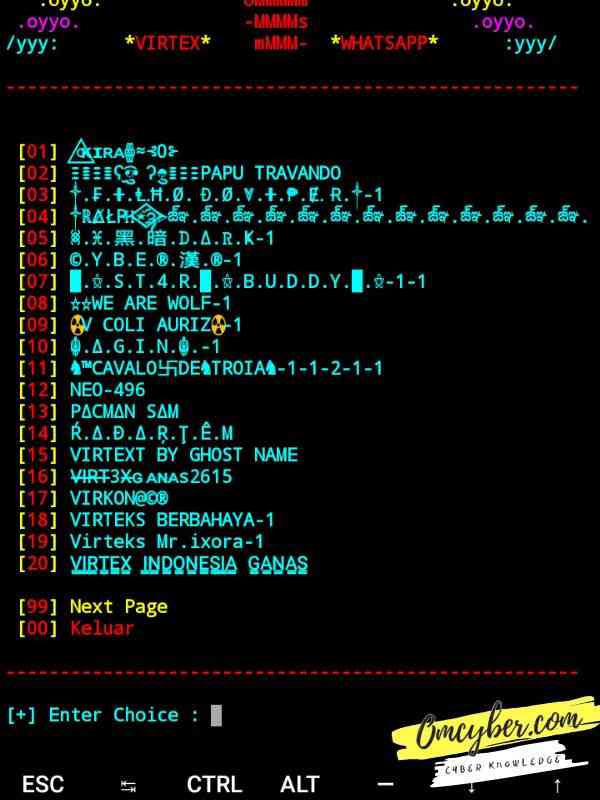 Ketika kita mengirimkan Virtex kepada target atau korban maka akan menyebabkan aplikasi Whatsapp di HP target akan menjadi lag lemot atau force close. Chmod x Virtexsh ls sh Virtexsh Jika langkah-langkah diatas sudah dilakukan semua maka akan tampil menu atau urutan jenis Virtex-nya. Selanjutnya kalian harus menginstal script virtex wa dan melakukan proses pembuatan dari script tersebut.